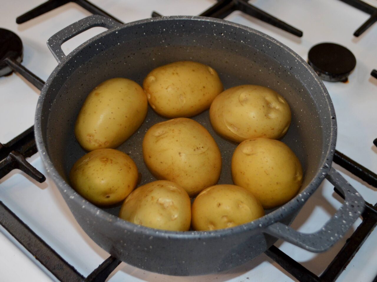 - Spalati cartofii cu coaja si transferati-i intr-un recipient cu apa. Fierbeti cartofii timp de 30-35 de minute, pana vor fi gata. Eu am folosit cartofi noi, dar puteti folosi si cartofi vechi.