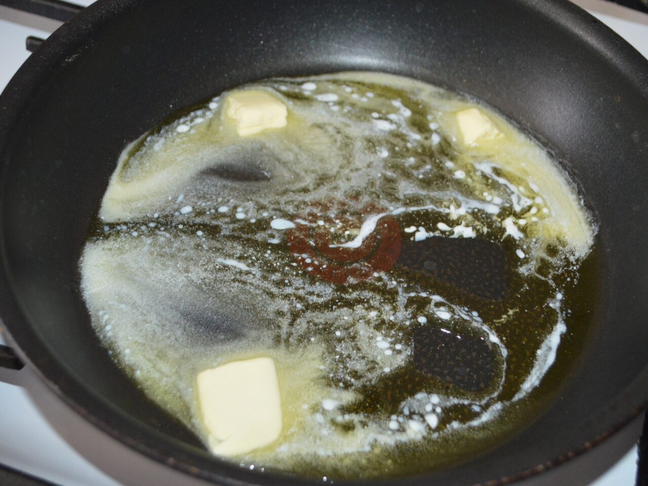 - Intr-o tigaie turnati putin ulei de masline si cateva bucatele de unt. Porniti focul ca sa se topeasca untul mai intai.