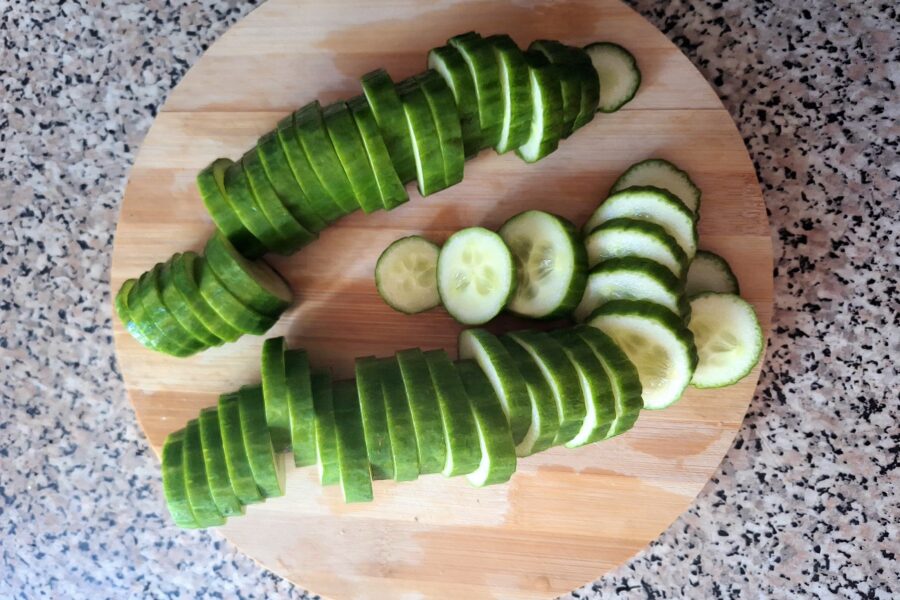 - Spălați castraveții și tăiați-i în rondele de aproximativ 5-6 mm.