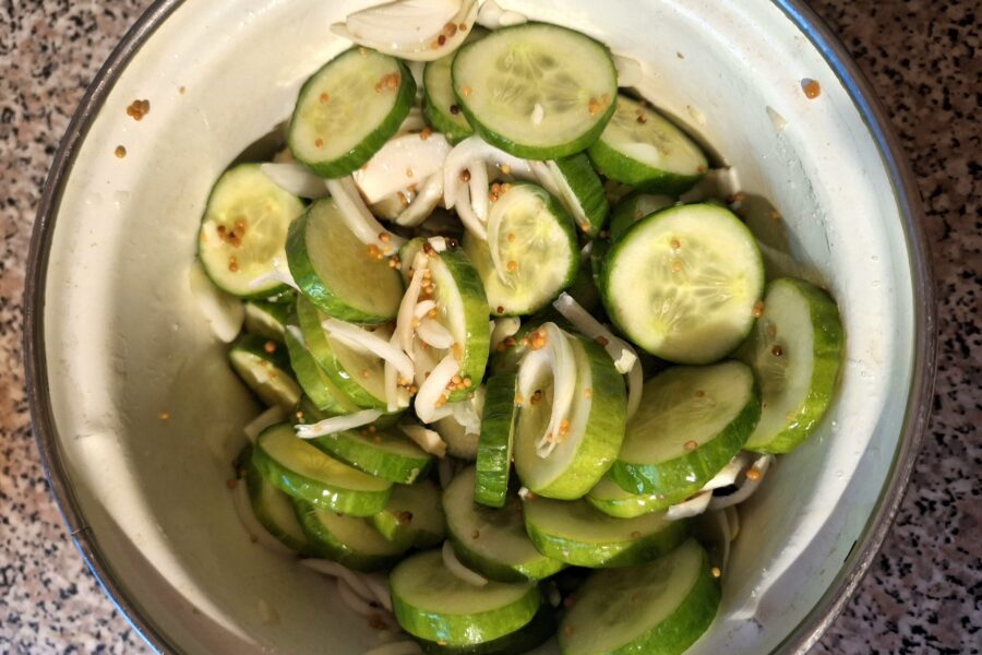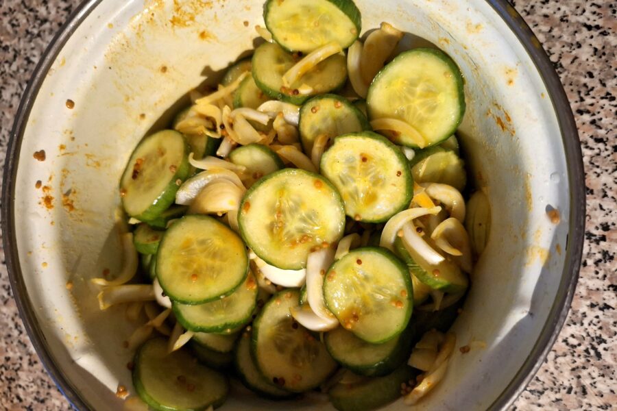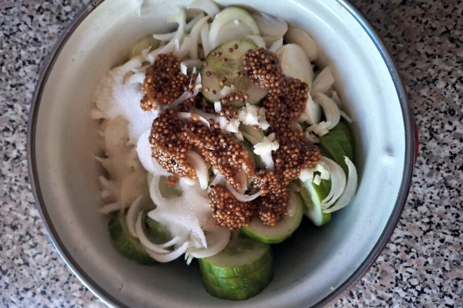 - Amestecați castraveții, ceapa, usturoiul, sarea, zahărul, oțetul, coriandrul și muștarul în boabe într-un vas potrivit și puneți-l în cuptorul cu microunde timp de 3 minute.