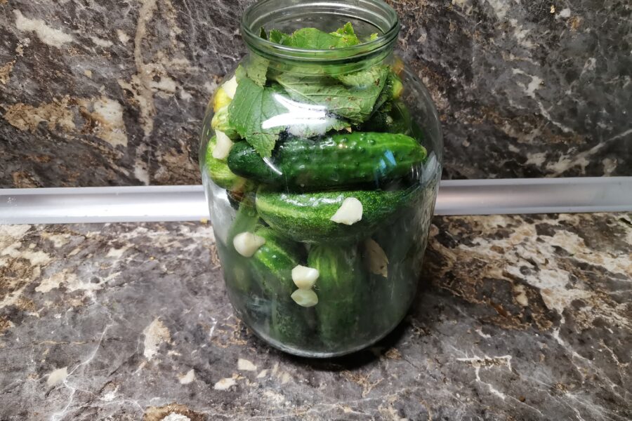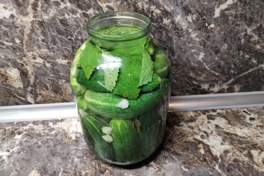 - Puneti castravetii intr-un borcan de sticla sterilizat. Puneti usturoiul tocat intre ei si frunzele de coacaze deasupra.