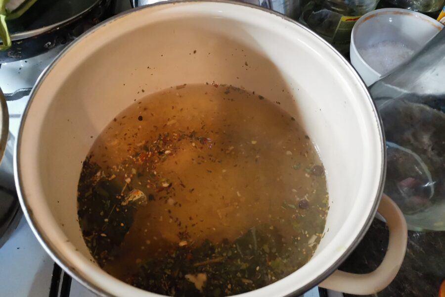 - Cand apa se raceste si devine la temperatura camerei, fierbeti din nou si turnati iarasi borcanul cu castraveti. Scurgeti apa, fierbeti-o din nou, adaugati frunza de dafin, sarea, zaharul, otetul si condimentele. Fierbeti timp de 2-3 minute, pentru ca mirodeniile sa dea aroma.