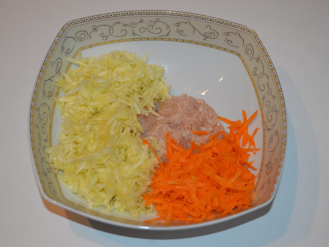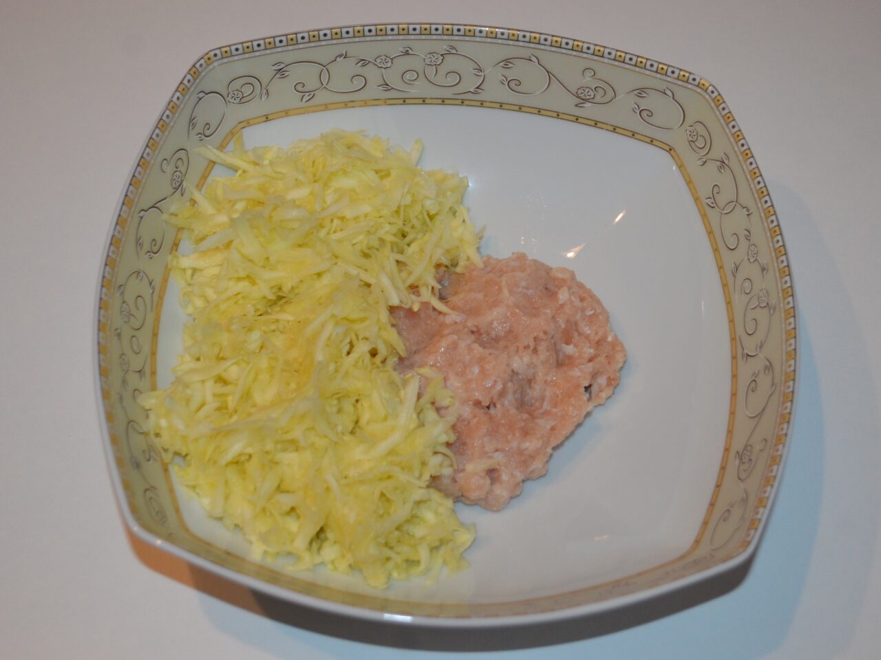 - Radeti dovlecelul pe o razatoare grosiera si lasati intr-un recipient pentru cateva minute, apoi scurgeti apa din dovlecel presandu-l cu mainele, apoi adaugati in bol la carnea tocata.