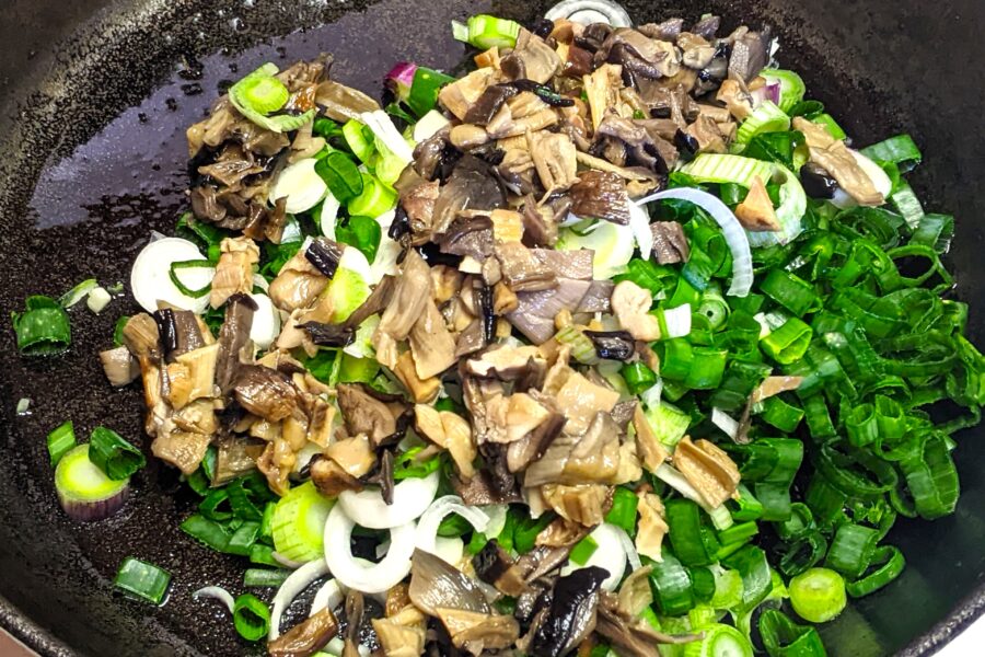 - Mai intai se pregateste umplutura pentru chiftele. Puneti ciupercile uscate la inmuiat, apoi fierbeti-le in apa cu sare. Taiati ceapa verde si ciupercile, si prajiti-le in ulei de masline.