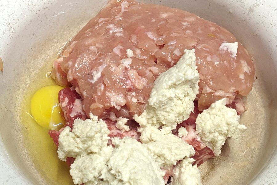 - Intr-o farfurie comoda turnati faina de porumb (sau de grau). Alaturi, puneti un bol cu apa si un bol cu umplutura. Puneti umplutura pe palma umeda a mainii, se netezeste umplutura. Puneti umplutura in centru. Acoperiti din nou umplutura cu carne tocata. Formati o chiftea, treceti-o prin faina si puneti-o in ulei de masline incins.
