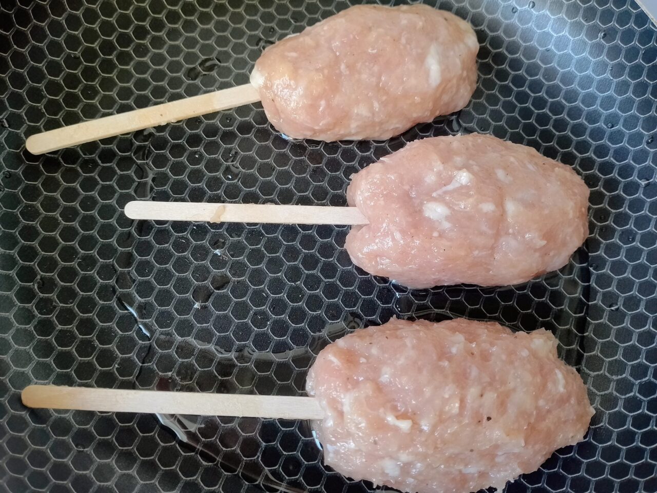 - Cu mainile umede, formati mici chiftele ovale si puneti betisoare de inghetata in mijloc. Puneti-le pe tigaie.