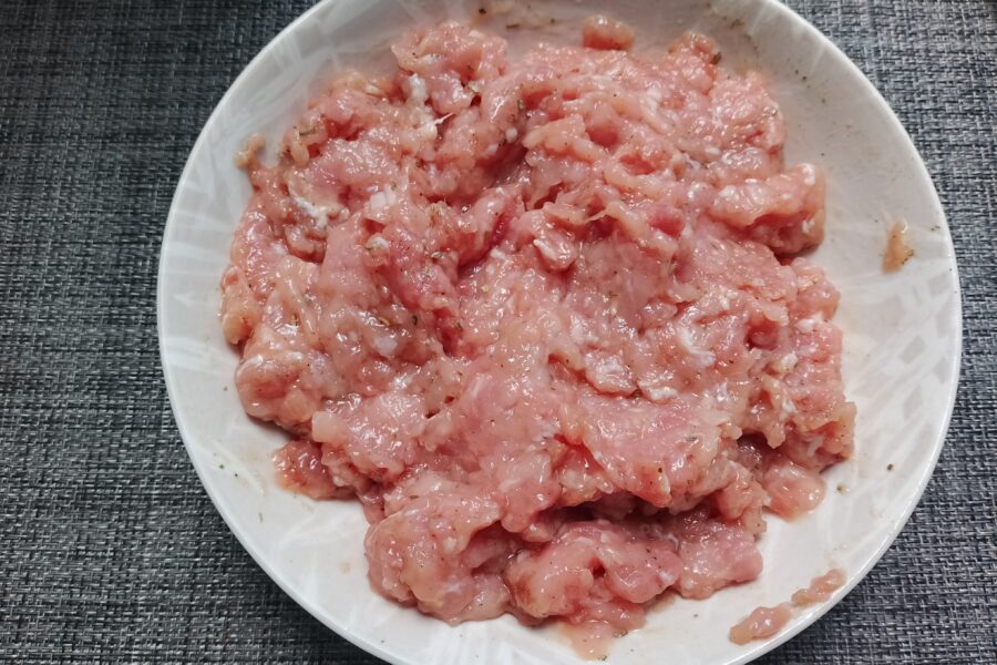 - Adăugați condimentele alese, sarea și oul la carnea tocată. Amestecați bine tocătura cu ingredientele adăugate până la omogenizare.