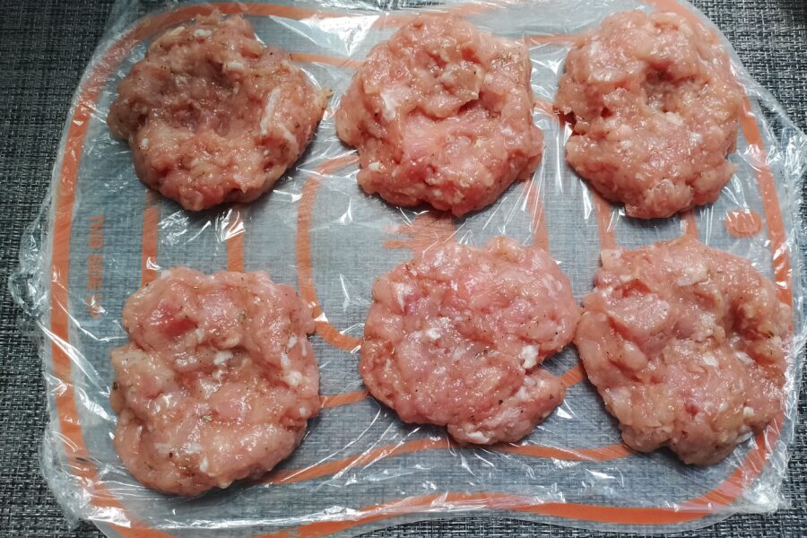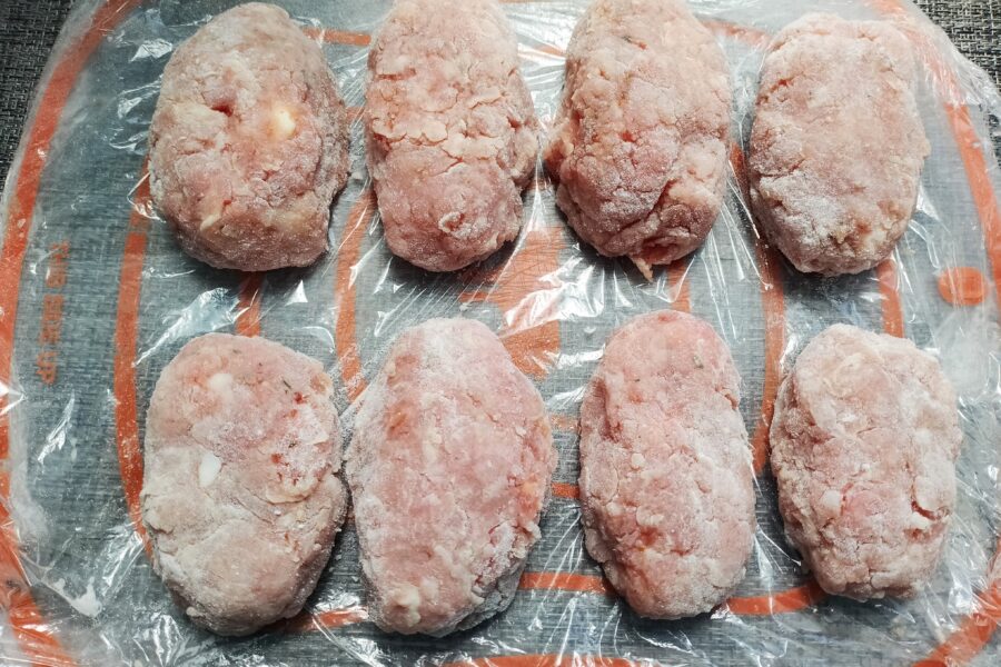 - Apoi, trebuie să formați baza pentru chiftele sub forma unei plăcuțe din carne tocată și să le întindeți pe o suprafață plată. Pentru comoditate, puteți acoperi placa cu folie alimentară.
