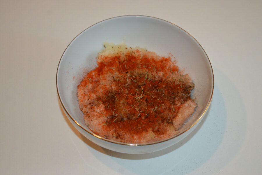 - Presarati sare, piper macinat, boia de ardei si cimbru dupa gust. Amestecati bine.