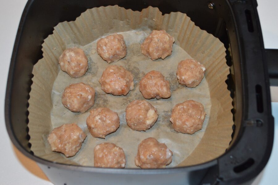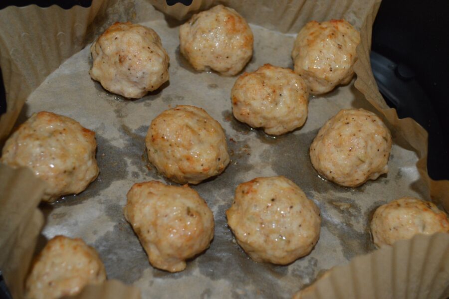 - Cu mainele ude formati chiftelute si puneti-le pe o hartie de copt in Air Fryer, setati la 200 de grade timp de 15 minute.