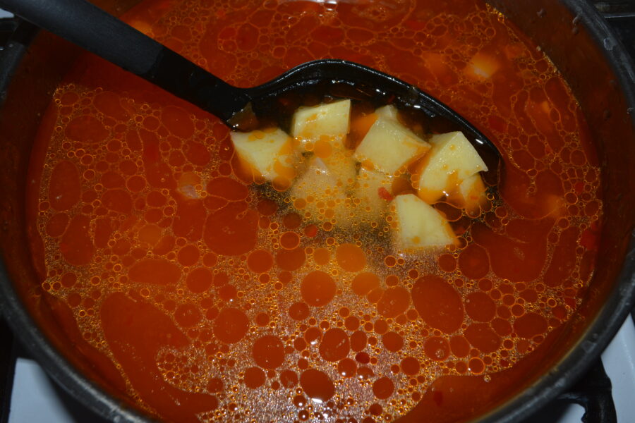- Turnati apa, si adaugati cartofii in cratita. Mariti focul la aragaz ca sa inceapa a fierbe.