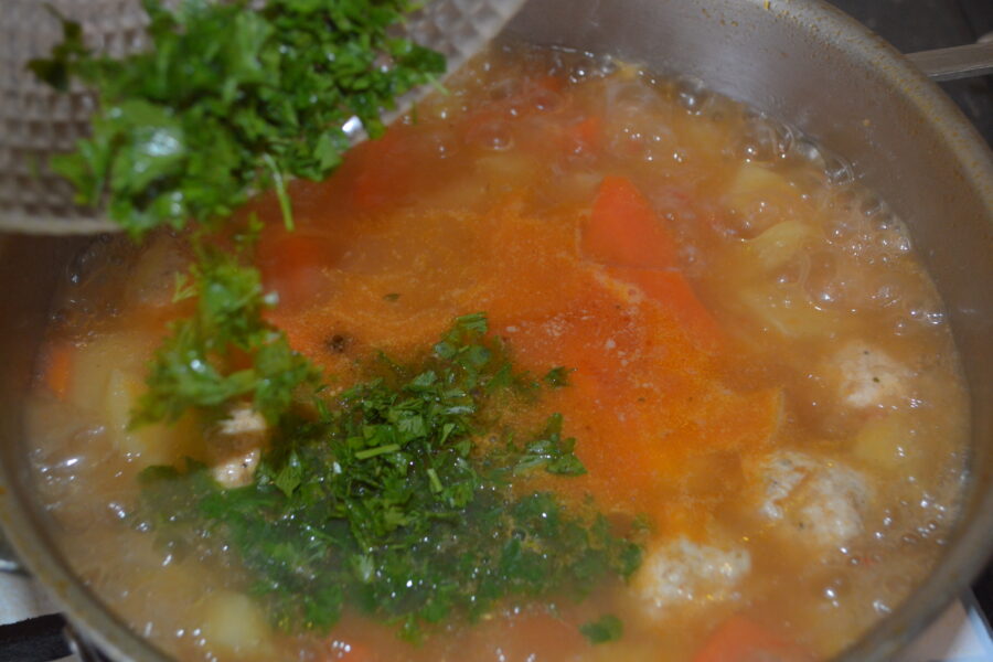 - Dupa ce au fiert taiteii, stingeti focul, adaugati acid acitric pe un varf de cutit, pentru a da putina acrime. Apoi taiati patrunjelul marunt si il puneti in ciorba.