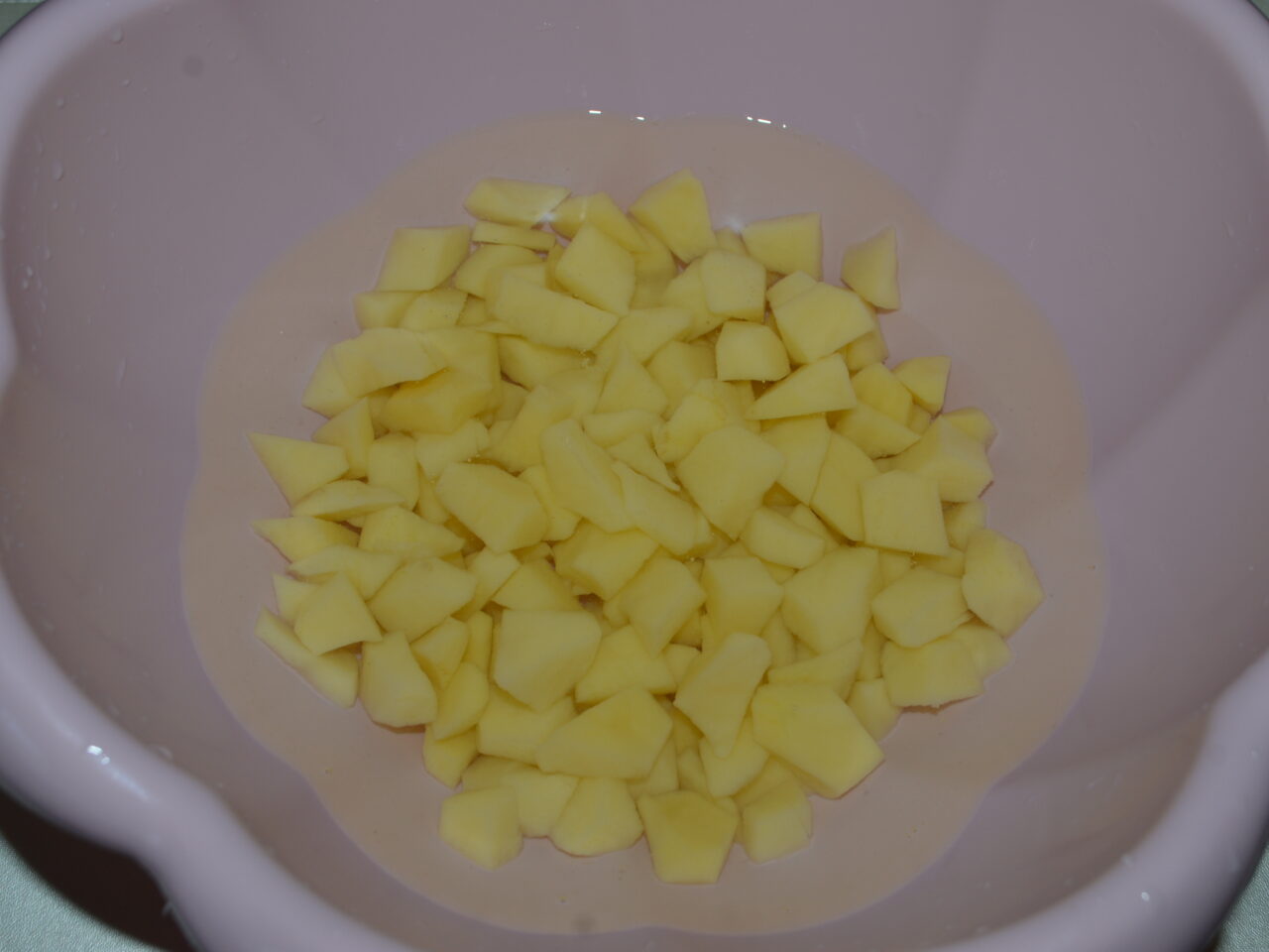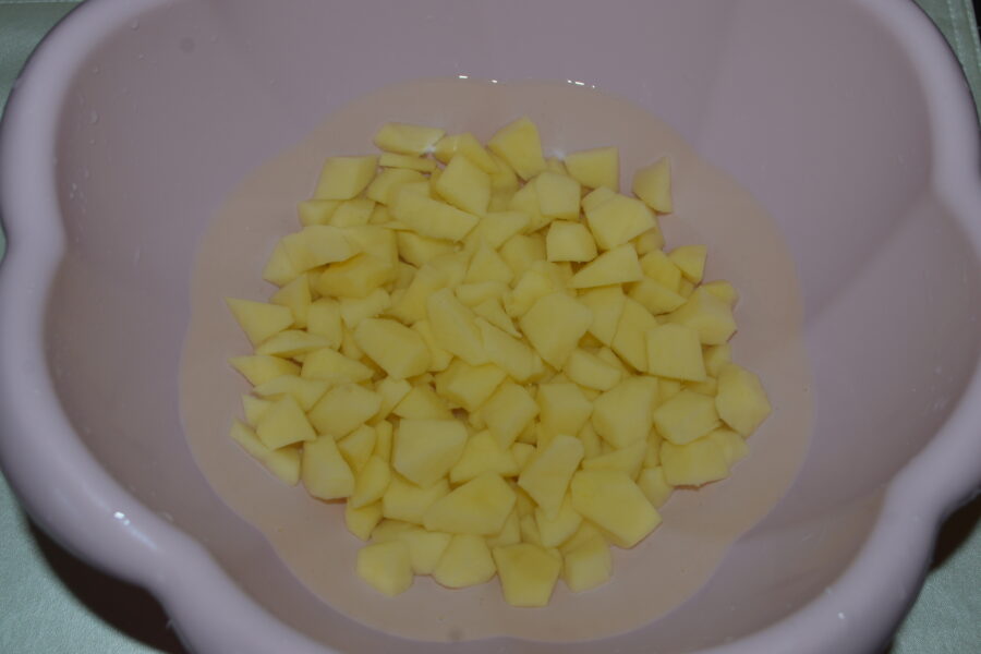 - Dupa ce legumele s-au calit bine, turnati apa in cratita si puneti cartofii. Adaugati o lingurita de sare.