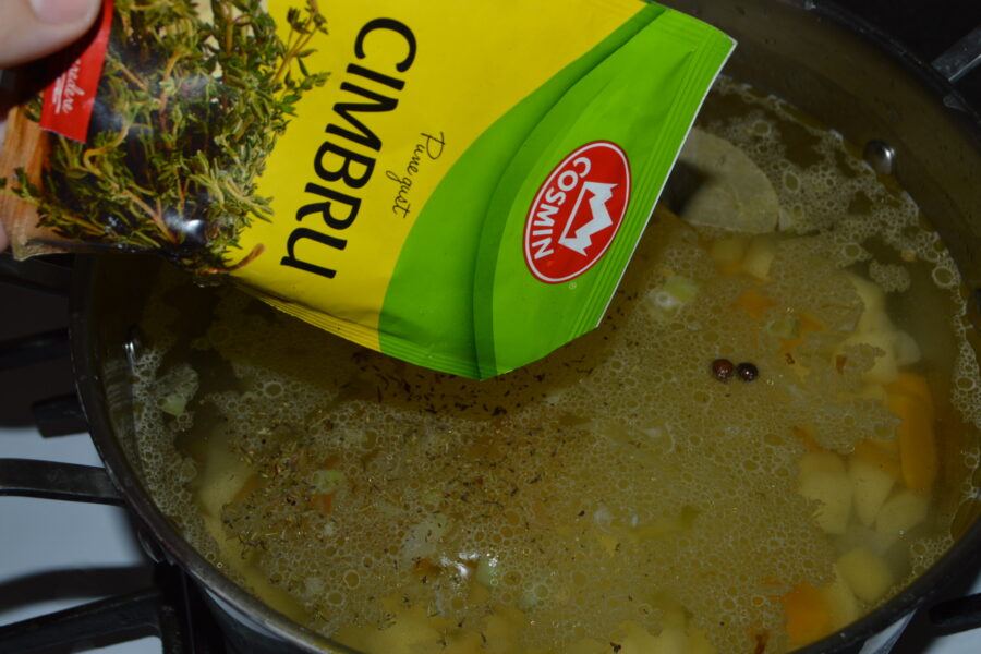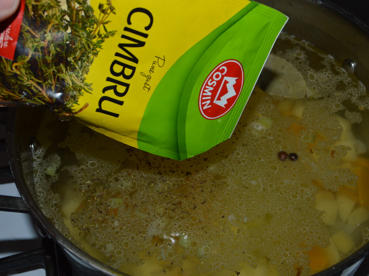 - Presarati putin cimbru macinat uscat. Dati focul la maxim ca apa sa inceapa a fierbe, apoi dupa ce a inceput a fierbe micsorati focul.