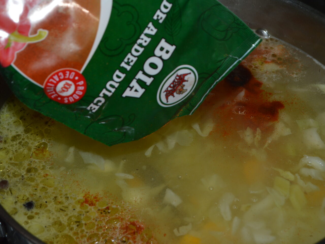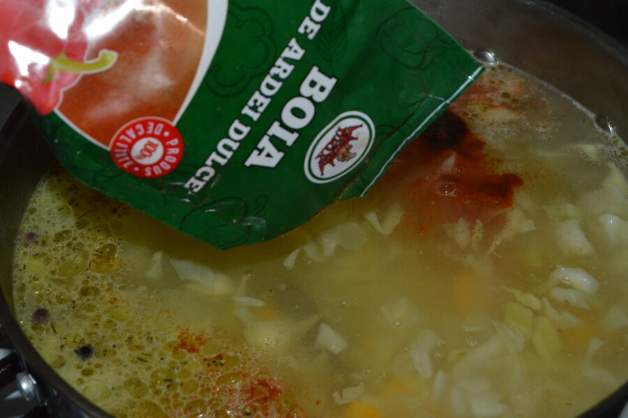 - Dupa ce legumele au fiert, presarati putina boia de ardei dulce.