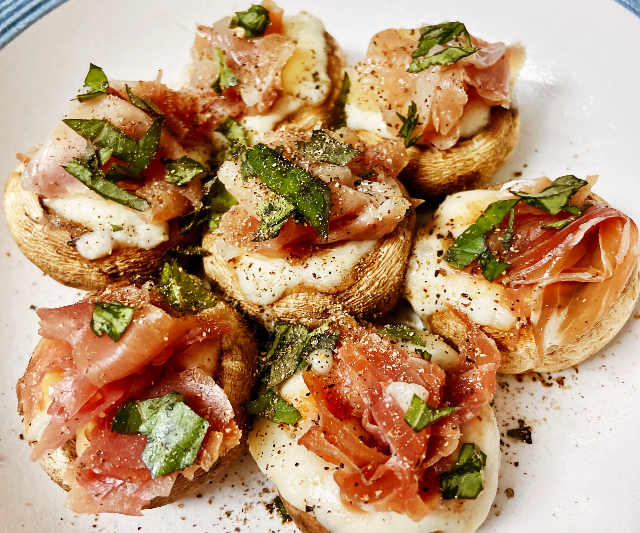 Scoateți ciupercile din cuptor, puneți câte o felie mozzarella pe fiecare capac de ciuperci și puneți deasupra o felie subțire de șuncă de Parma. Puneți tava cu ciupercile la cuptor și coaceți încă 5 minute până când cașcavalul se topește.