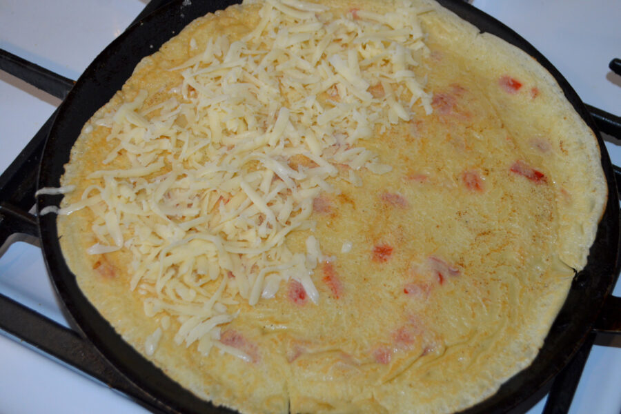 - Pe o jumatate a clatitei puneti cascavalul ras.