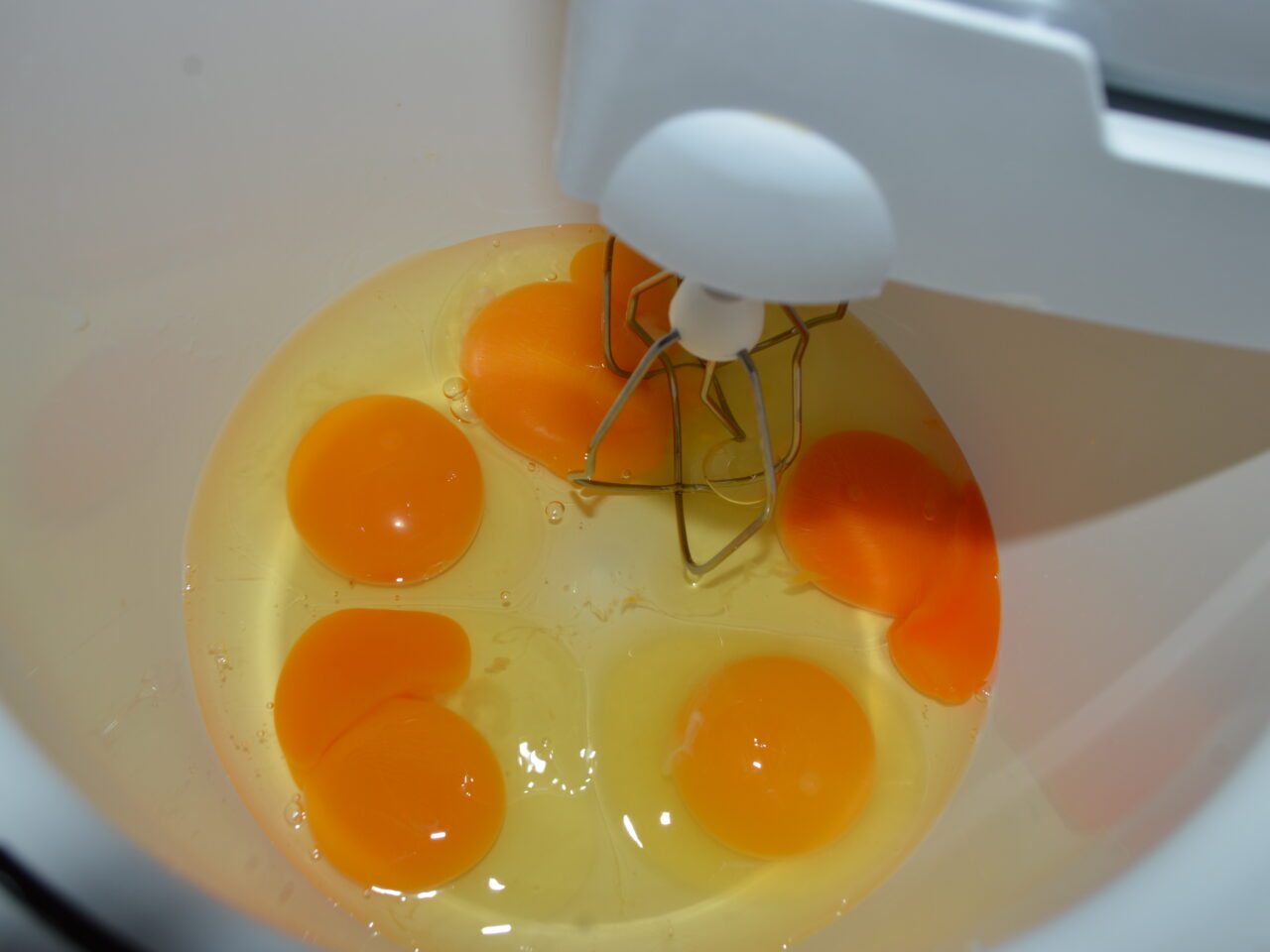 - Intr-un castron sparge-ti ouale, si bateti-le cu mixerul la viteza medie.