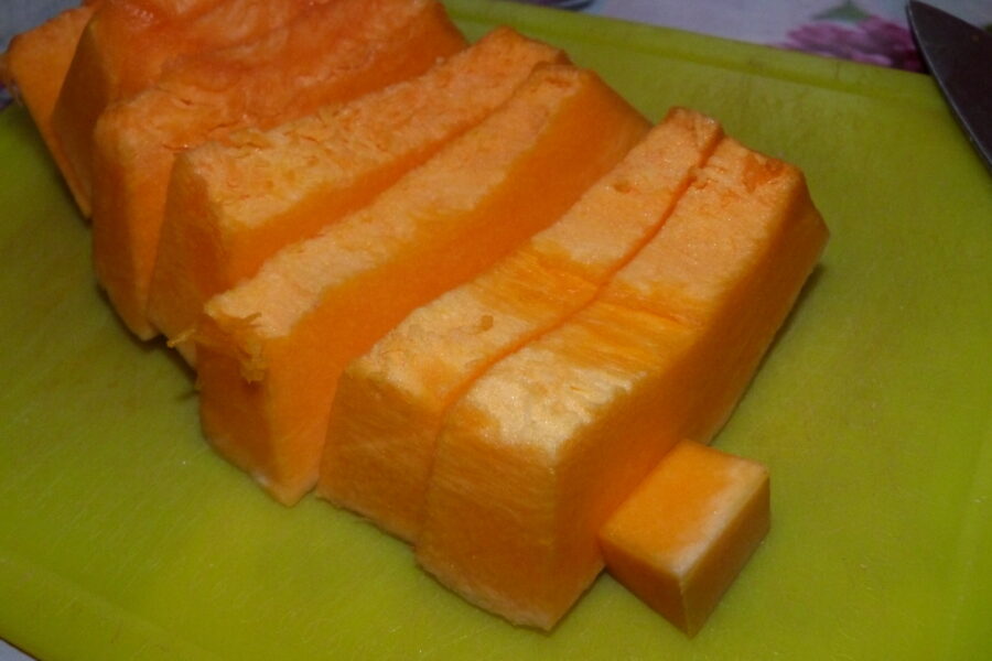 - Se decojește dovleacul, se taie în cuburi mici și se fierbe în apă cu sare până se înmoaie.