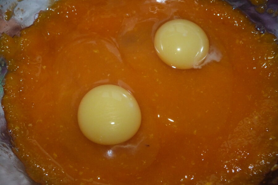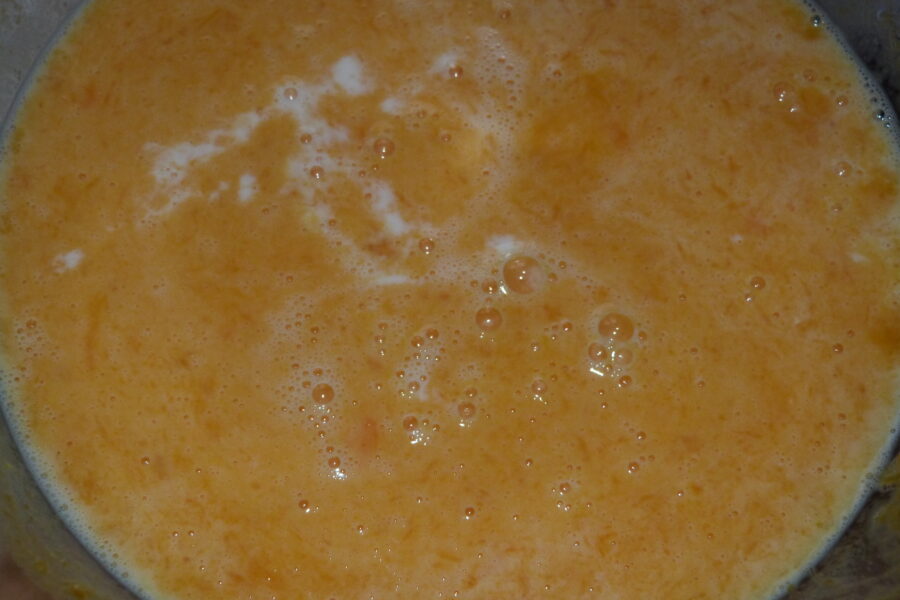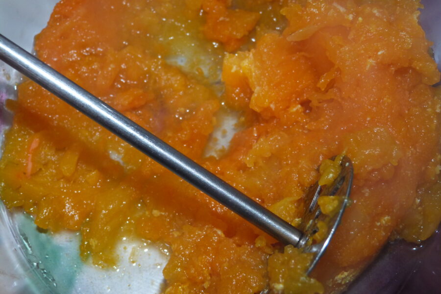 - Se frământă pulpa de dovleac fiert cu ajutorul unui concasor sau al unui blender.
