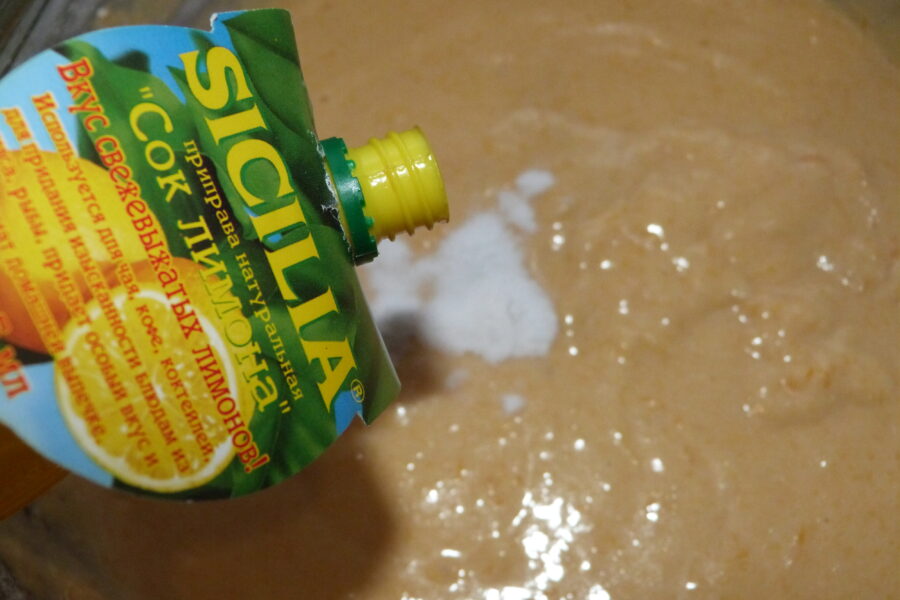 - Acum este rândul bicarbonatului de sodiu. Pentru a evita gustul de bicarbonat de sodiu în produsul finit, acesta trebuie stins cu suc de lămâie. Se lasă aluatul să stea pentru a permite ingredientelor să reacționeze.