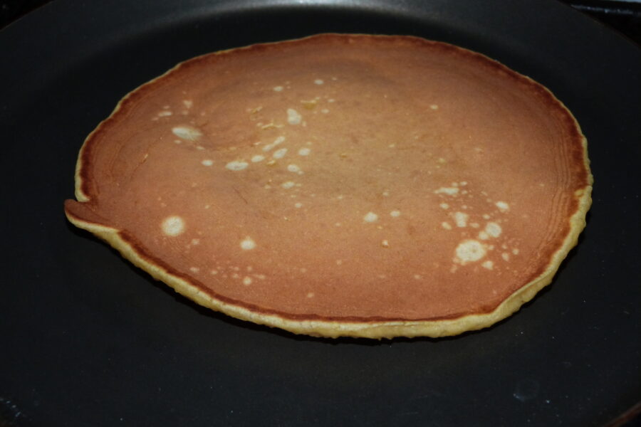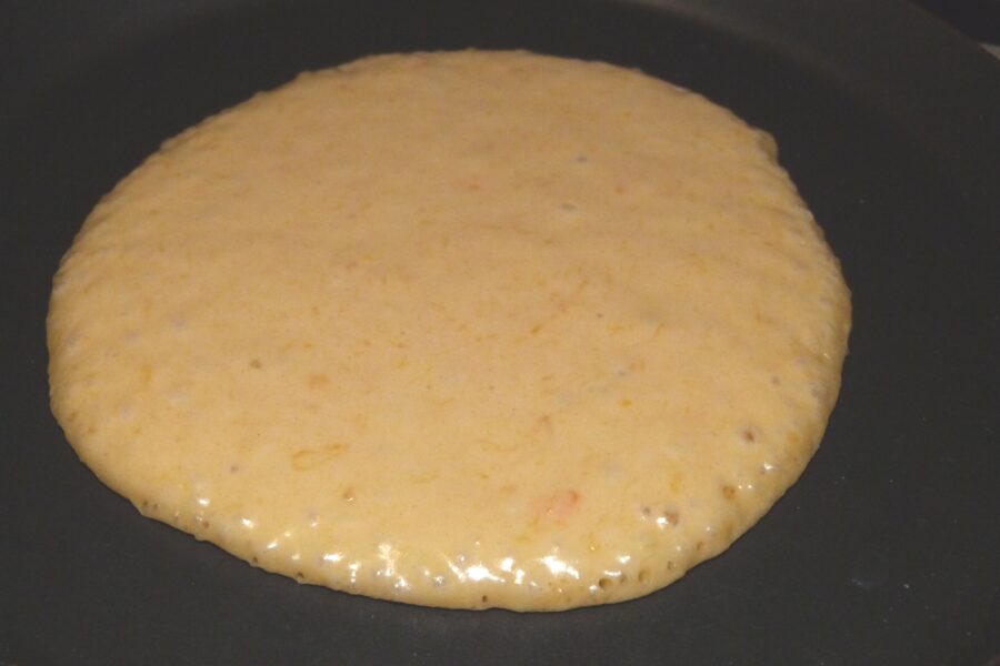 - Se toarnă cantitatea dorită de aluat pe o tigaie uscată. Se prăjește până când apar bule de aer în jurul marginilor clătitei. Nivelul focului: minim.