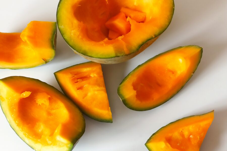 - Spalati dovleacul, desfaceti-l, indepartati miezul cu semintele, taiati coaja, taiati pulpa in cuburi de aproximativ doi pe doi centimetri.