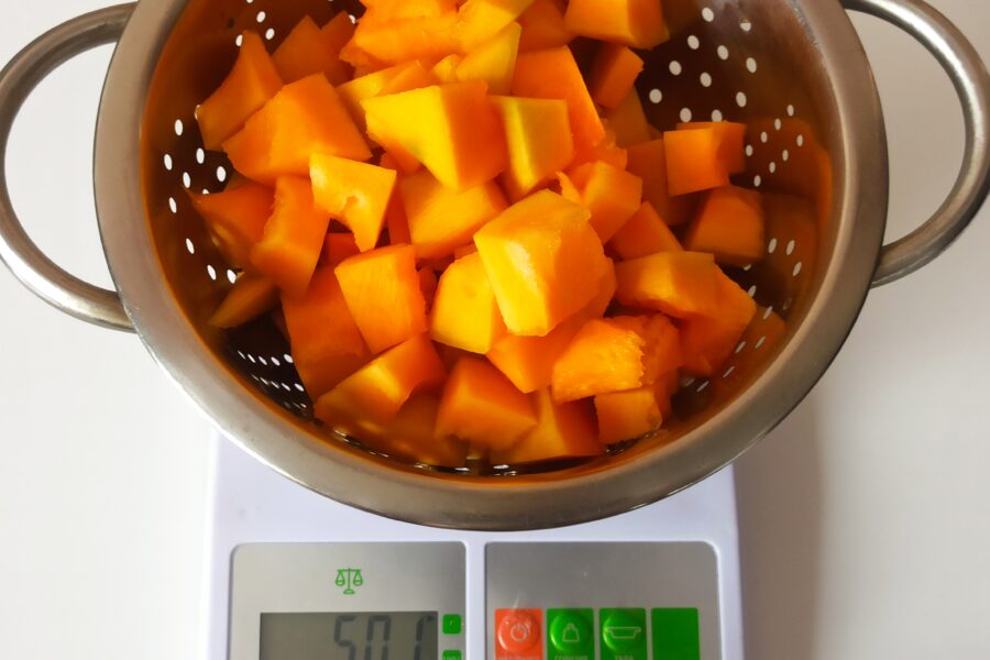 - Dovleacul trebuie sa fie de 500 de grame in forma decojita. Fierbeti-l pe aburi timp de 10 minute sub capac.