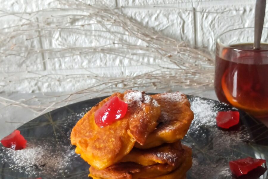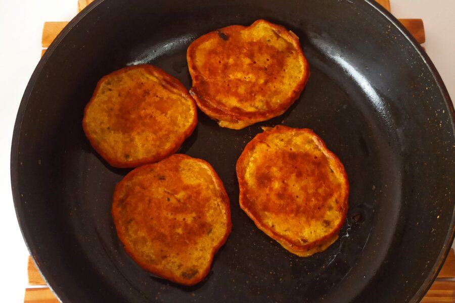 - Pe o tigaie incinsa cu ulei vegetal, puneti aluatul cu o lingura, inmuiata in apa rece. Prajiti timp de 3-4 minute pe fiecare parte.