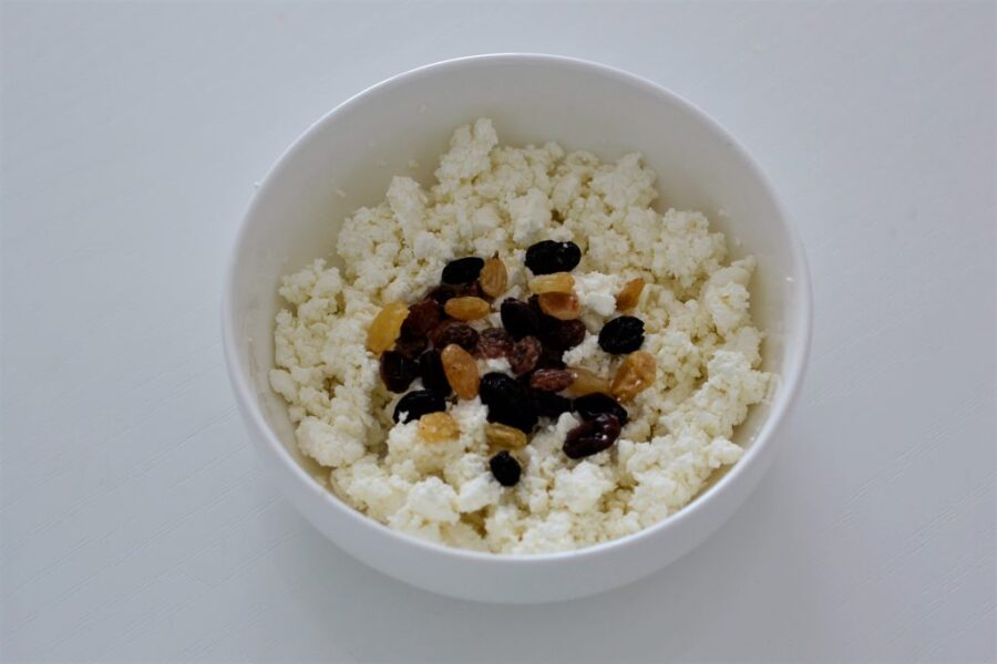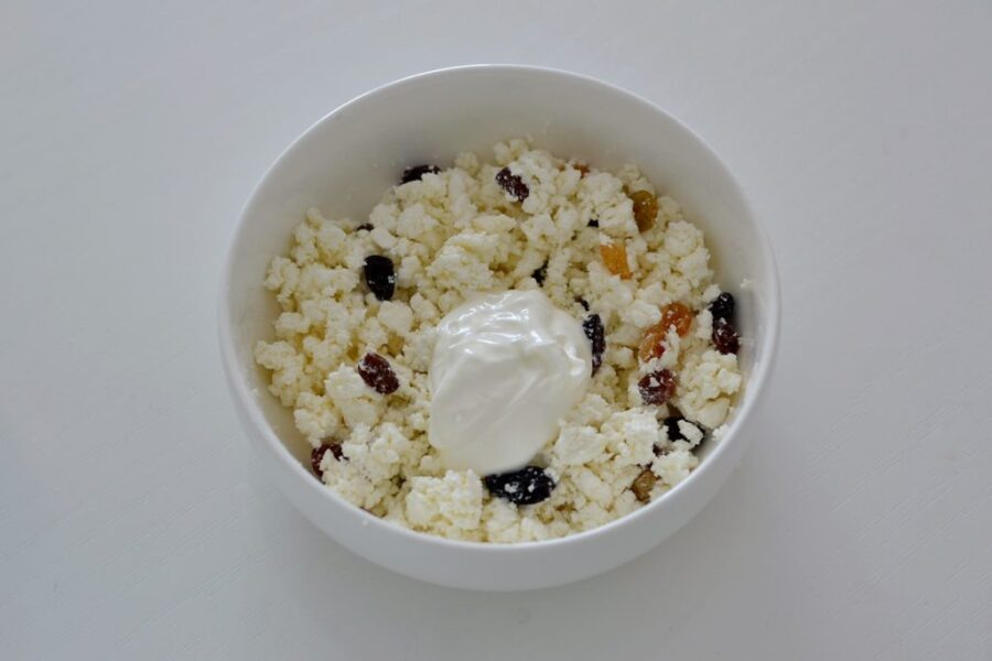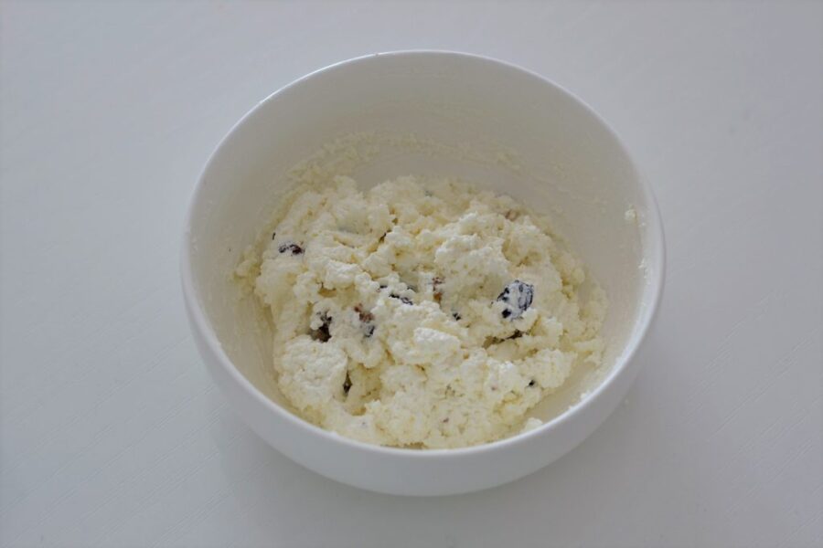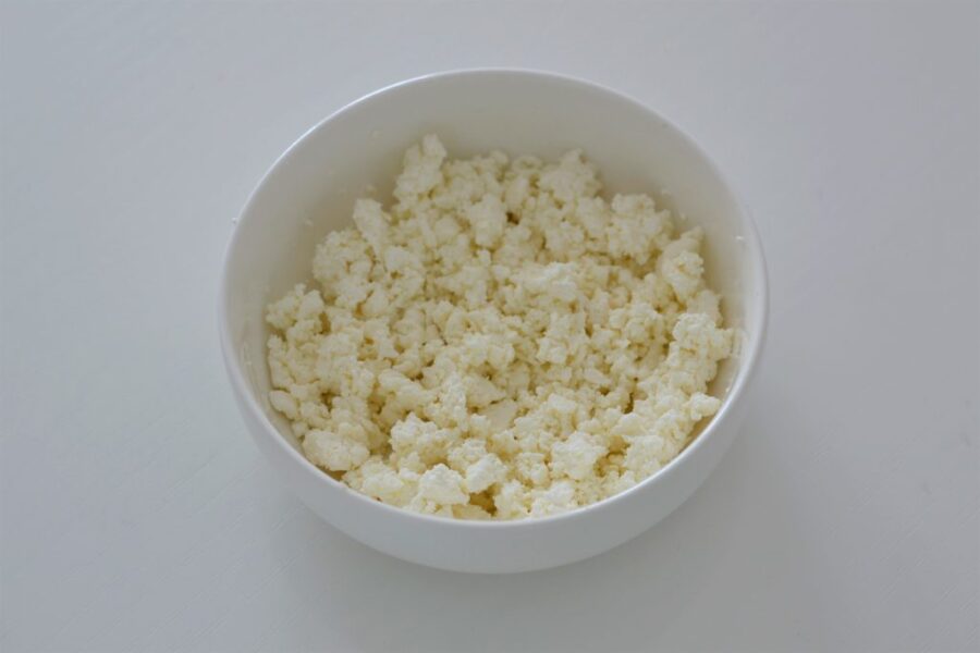 - Pentru umplutura de brânză de vaci, puneți brânza de vaci într-un castron spațios și frământați bucățile mari cu o furculiță.
