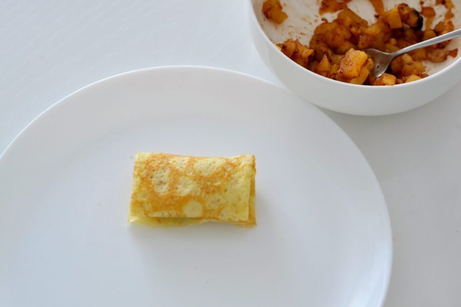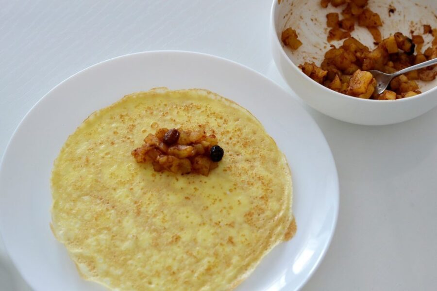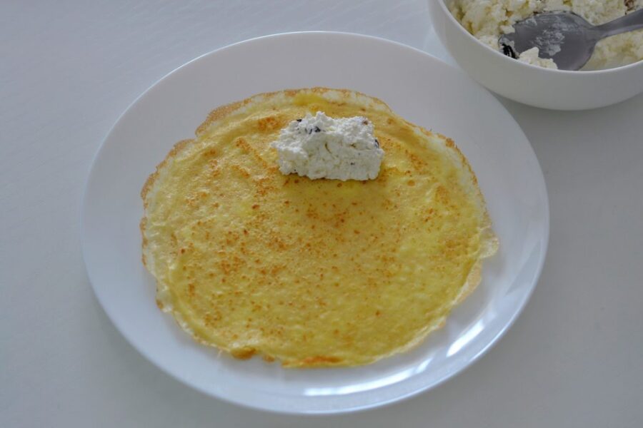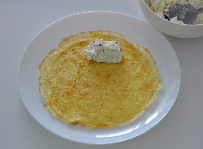 - Se întinde o porție mică de brânză de vaci pe marginea clătitei.