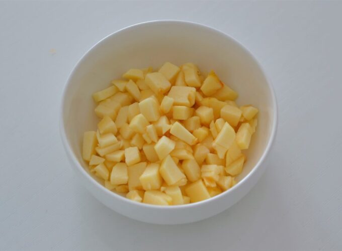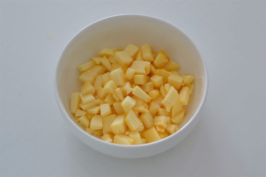- Pentru umplutura de mere, se decojesc cu un curățător de legume, se îndepărtează miezul și se taie în cuburi mici.