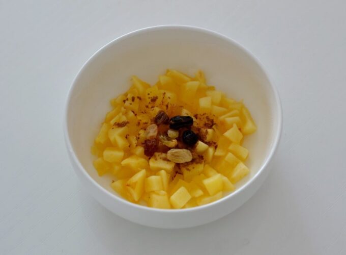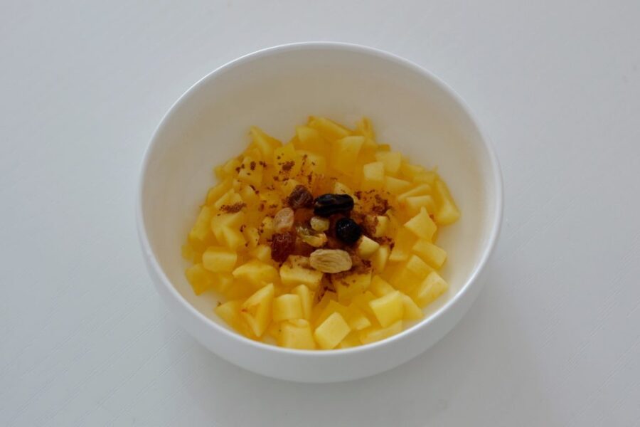 - Se pun merele tăiate felii în orice recipient convenabil și se introduc în cuptorul cu microunde, pe programul de microunde la 850W, timp de 3 minute.
