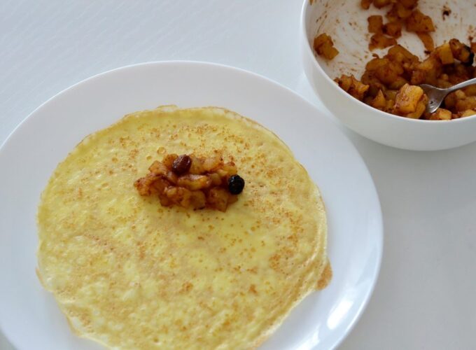 - Se întinde umplutura de mere pe clătite.