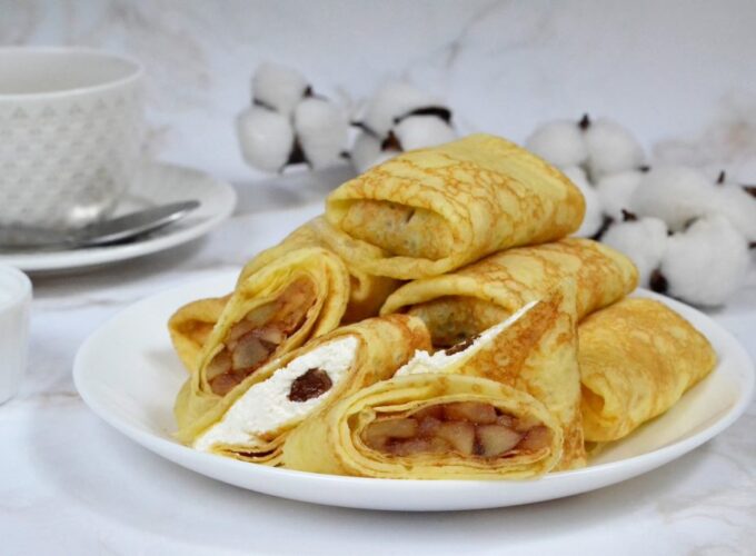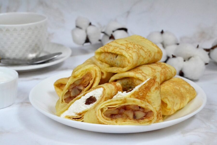 Clătitele cu diferite umpluturi sunt o gustare excelentă pentru muncă, călătorii sau școală. Vă sugerăm să faceți clătite cu umplutură de brânză de vaci și mere. Clătitele vor fi gătite cu lapte cu făină de porumb și amidon. Datorită făinii de porumb, clătitele ies de o culoare galbenă frumoasă.