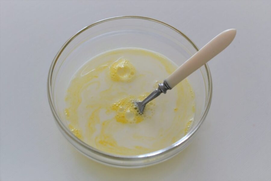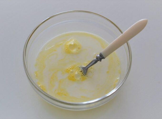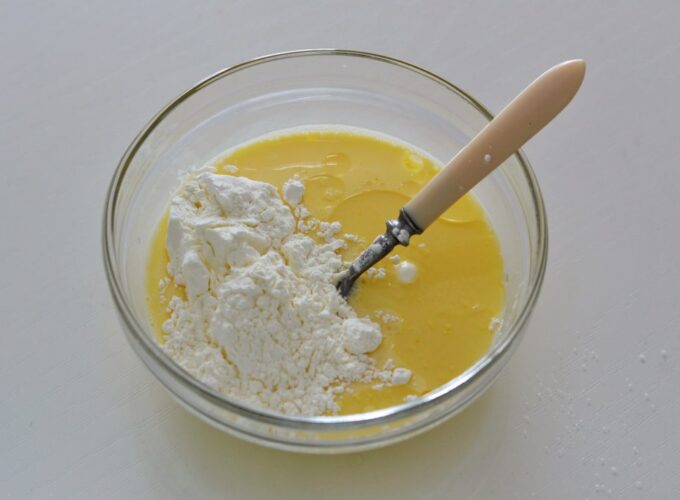 - Se toarnă laptele și uleiul vegetal în castron și se amestecă din nou.