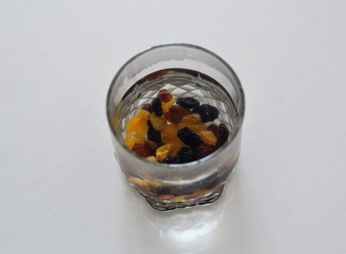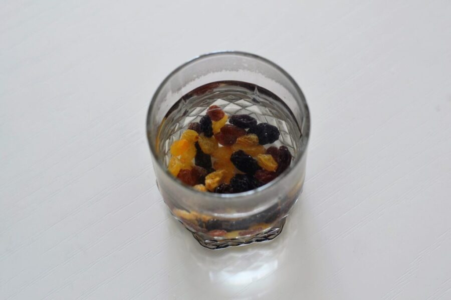 - Se toarnă apă clocotită peste boabele de stafide și se lasă să se umfle timp de 5-7 minute, apoi se clătesc bine de codițe și se șterg de praf.