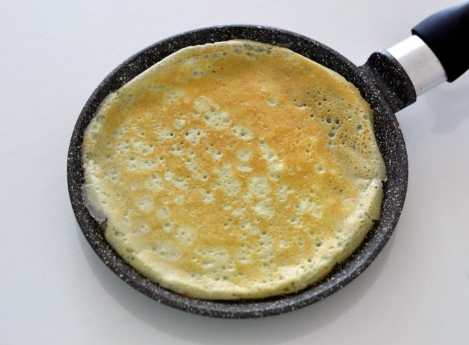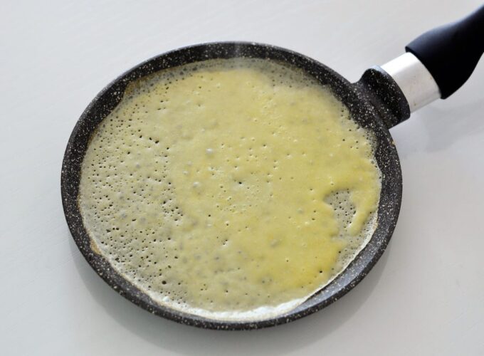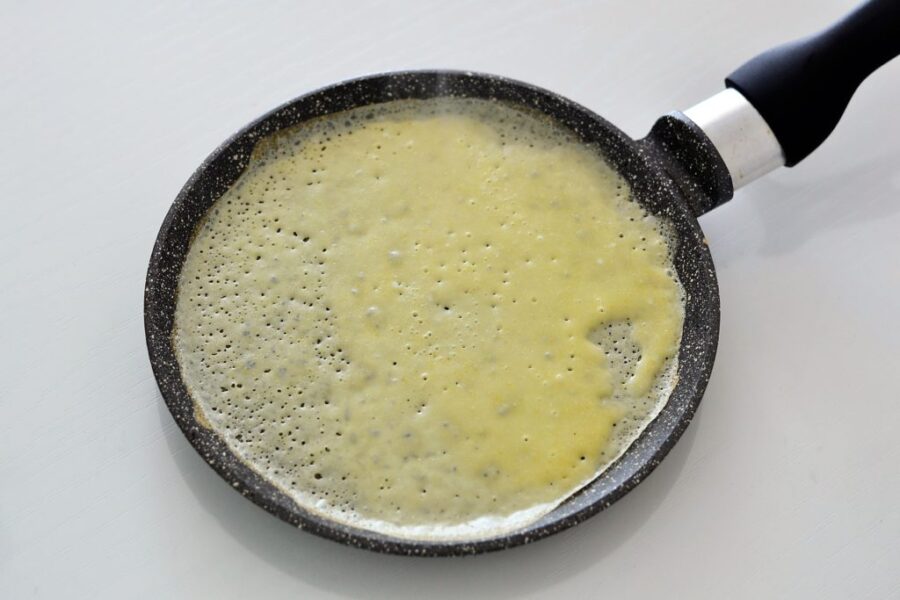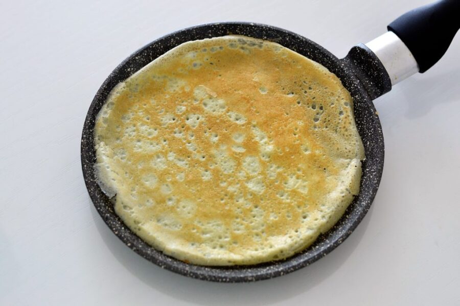 - Se toarnă o porție de aluat într-o tigaie bine încinsă și se gătește la foc mic până la rumenirea dorită.