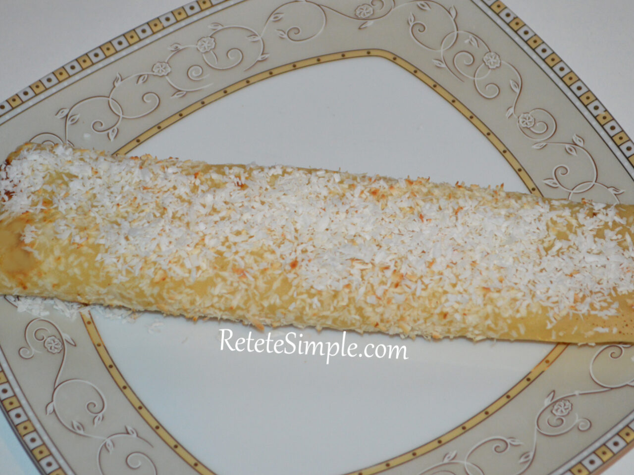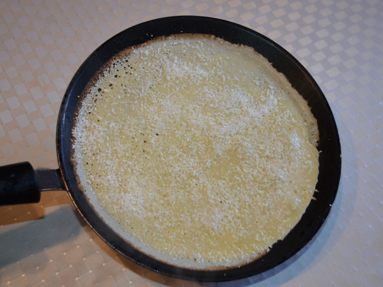 - Ungeti cu o perie de bucatarie putin ulei sau unt topit, apoi turnati un polonic din aluat si va staruiti repede sa rotiti tigaia in asa fel incat aluatul sa se extinda pe tot diametrul tigaii. Presarati nuca de cocos razuita pe suprafata clatitei si lasati sa se coaca 10-15 secunde.