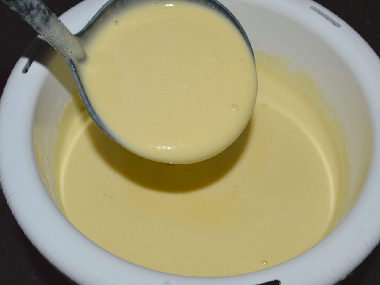 - Intr-un bol adanc adaugati ouale, zaharul si sarea si bateti cu mixerul pana se dizolva zaharul. Apoi adaugati laptele, esenta de vanilie, apa clocotita si uleiul si bateti cu mixerul in continuare. La final adaugati faina treptat, poate doriti clatitele mai lichide sau mai groase in dependenta de gustul fiecaruia, de aceea nu turnati toata faina deodata. Aluatul de clatite este gata.