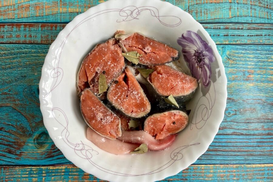- Sărați somonul roz. Se adaugă frunza de dafin ruptă și piper negru boabe.