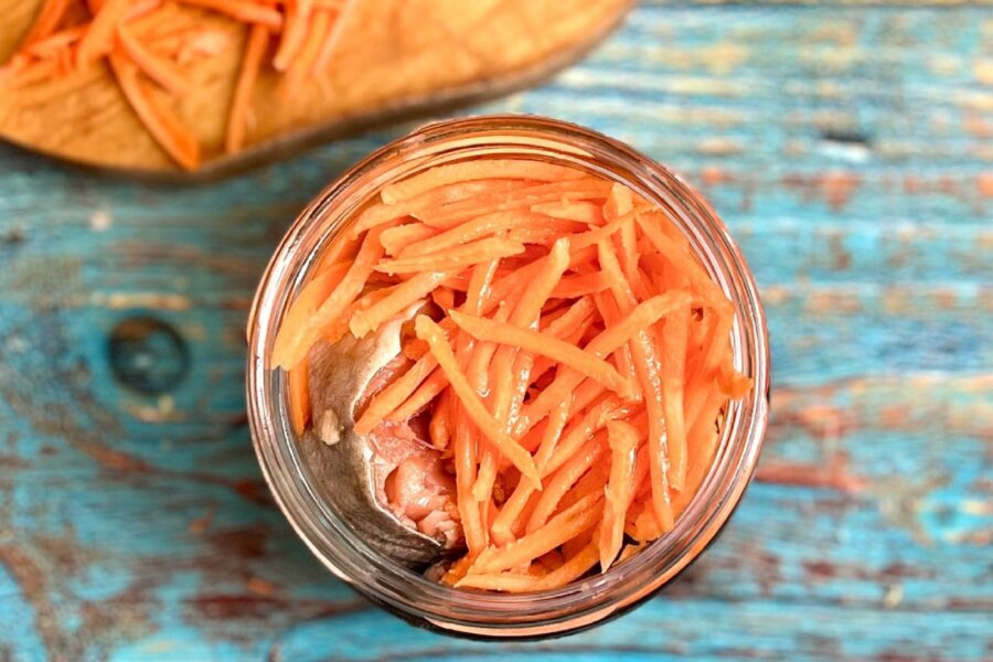 - Puteți adăuga morcovi rași. Borcanele se acoperă cu capace, care au fost spălate bine în prealabil și sterilizate în apă clocotită timp de 5 minute.