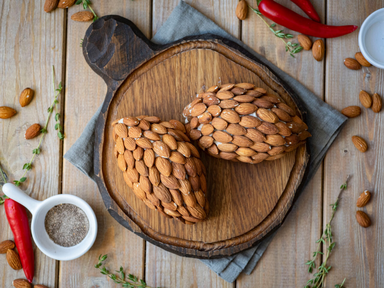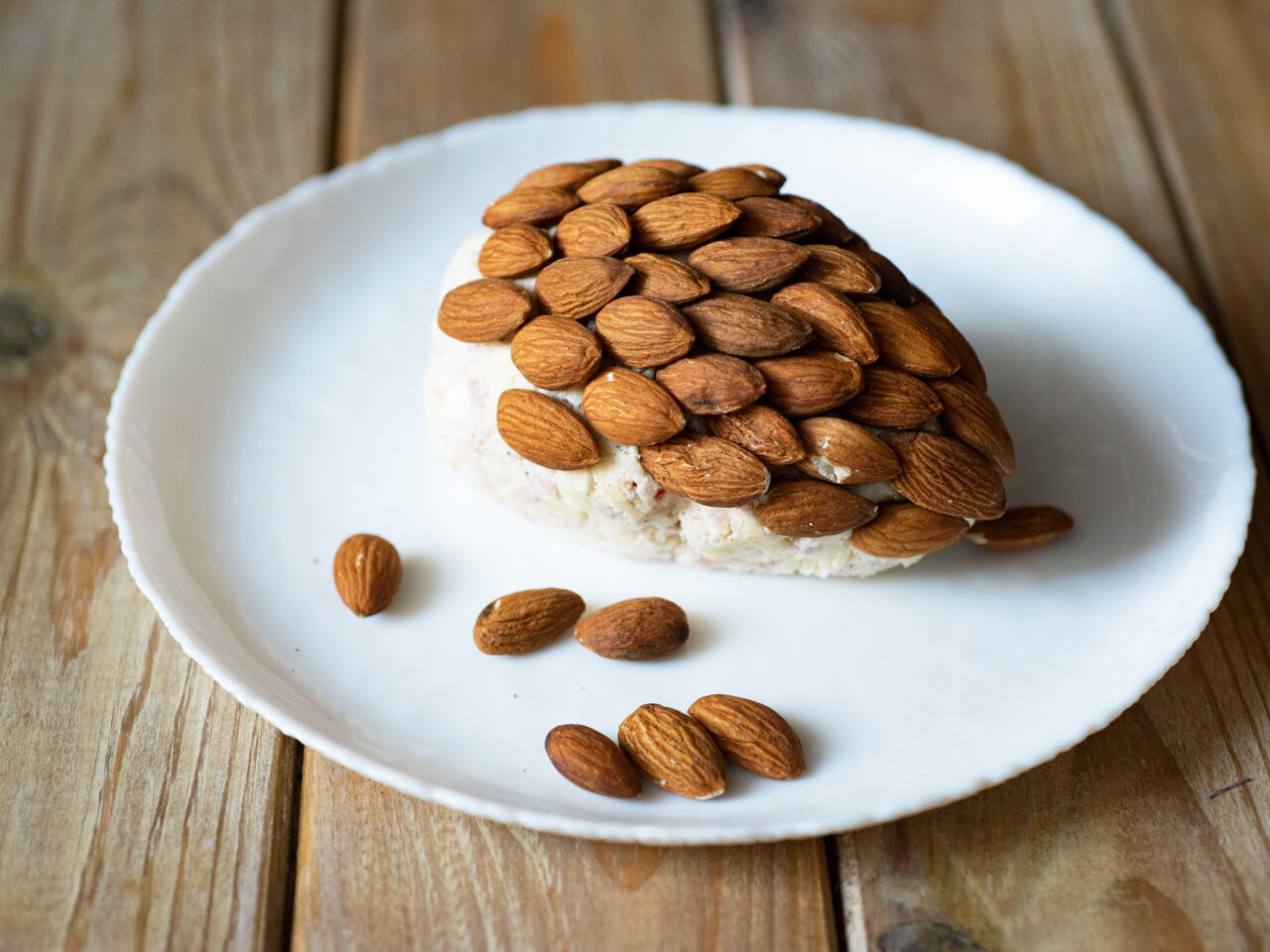 - Apoi vom începe să așezăm nucile de migdale pe suprafața, presând puțin, imitând scoarțele de pe un con.