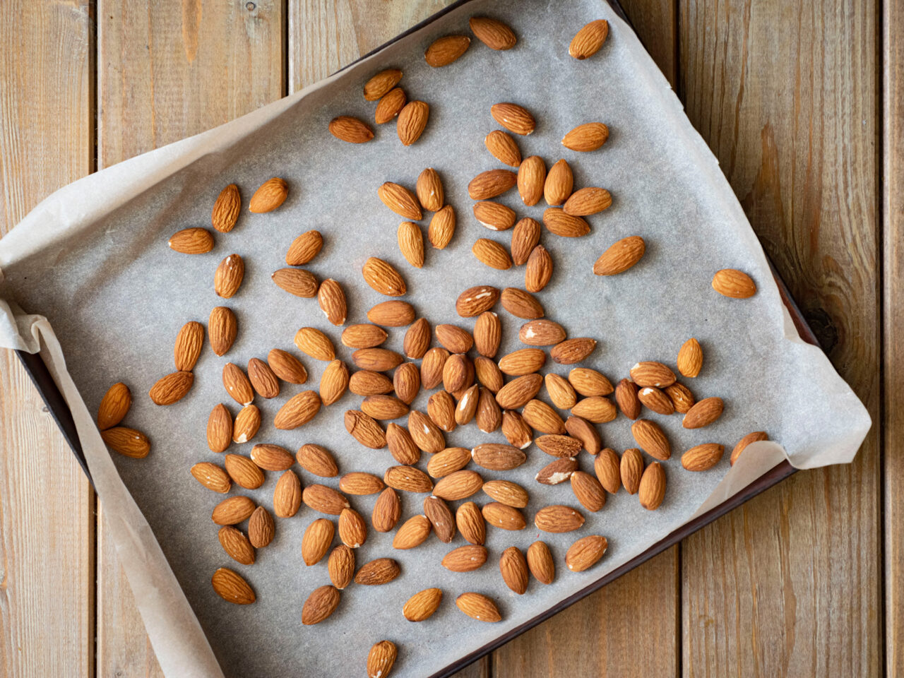 - Puneți toate migdalele pe tava de copt, întinzându-le uniform, și lăsați-le timp de 20-22 de minute la 150 de grade.