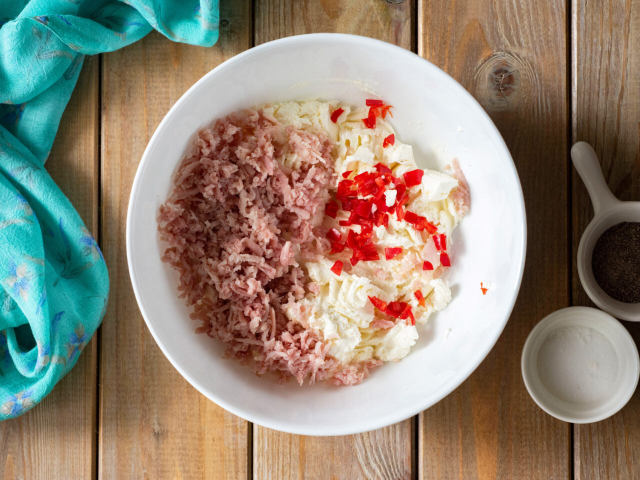 - În crema de brânză, adăugați șunca tocată și ardeiul iute jalapeno.