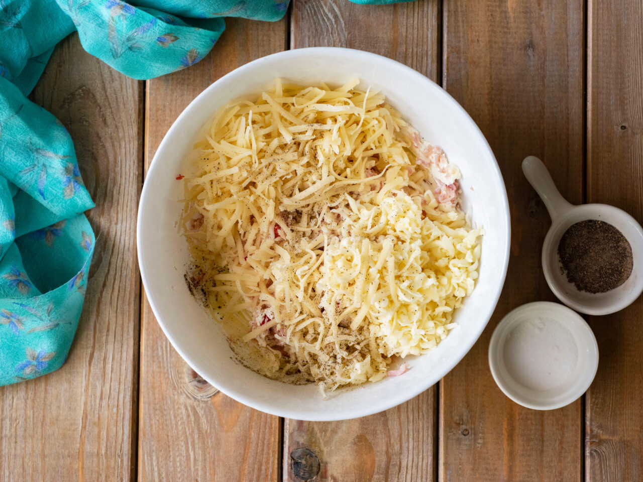 - Adăugați cașcavalul ras, piper negru măcinat și sare după gust. Nu uitați să gustați, deoarece cașcavalul și șunca sunt destul de sărate și este posibil să nu fie nevoie de sare deloc.