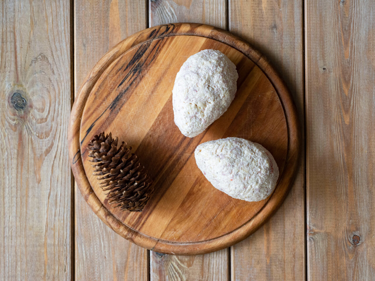 - Apoi împărțiți amestecul de brânză răcit în două părți egale. Folosiți-vă mâinile pentru a le modela pe fiecare în formă de con.