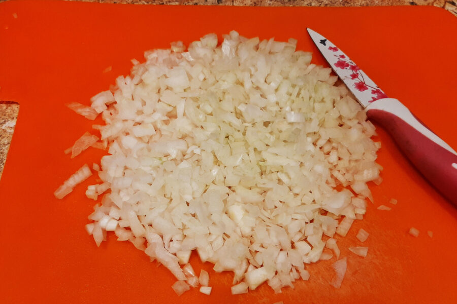 - Ceapa decojită se toacă mărunt.