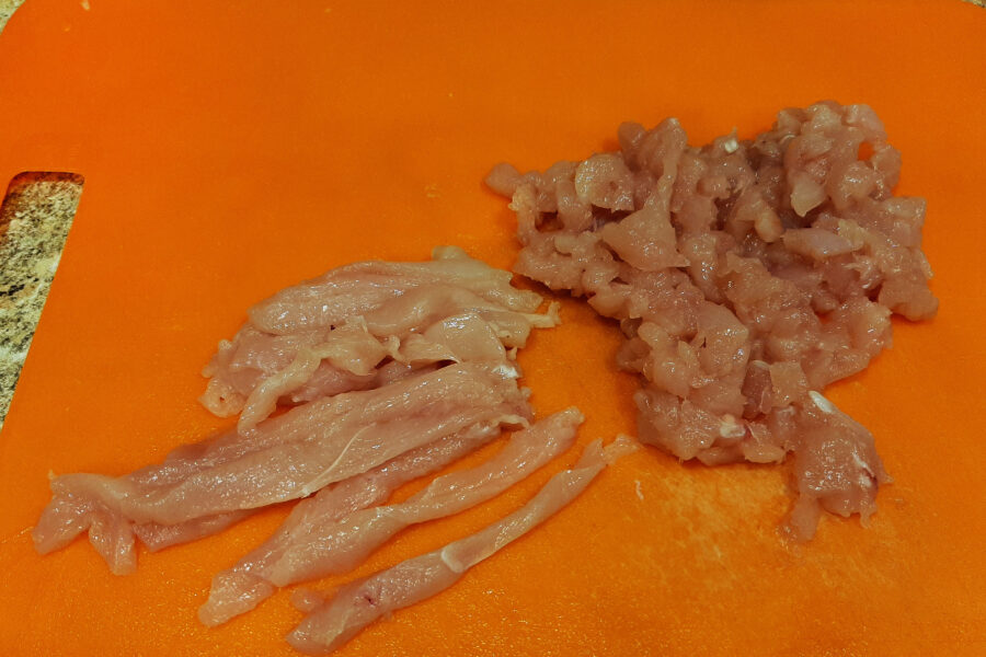 - Pieptul de pui este tăiat în bucăți foarte mici. Dacă se alege o altă parte din pui pentru gătit, mai întâi îndepărtați pielea și separați carnea de oase.