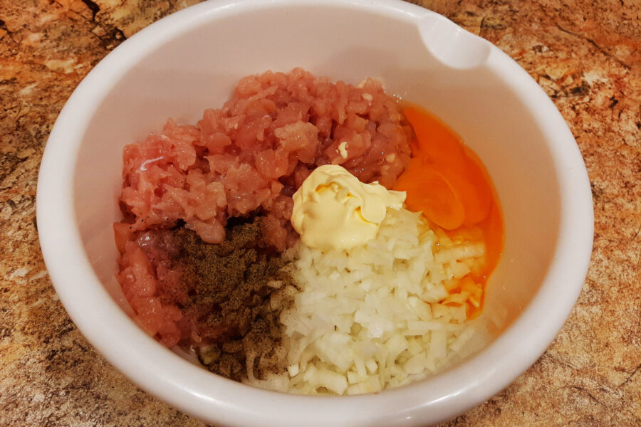 - Într-un vas adânc, amestecați puiul tocat și ceapa. Adăugați ouăle și maioneza în amestec. Sarați și piperați carnea tocată după gust, amestecați-o bine.